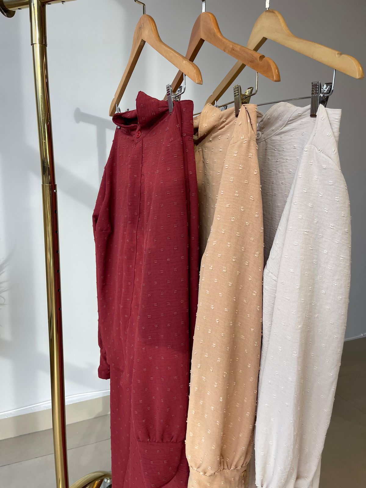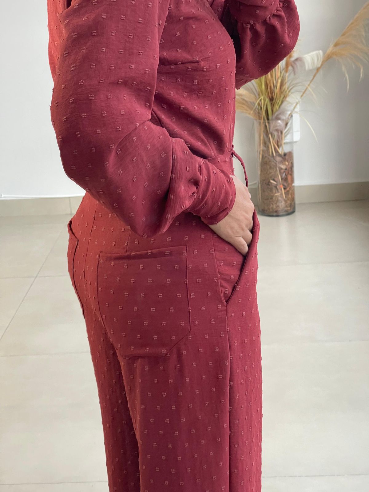 Camisa com botões, punho largo calça cos alto com zíper, botões e bolso