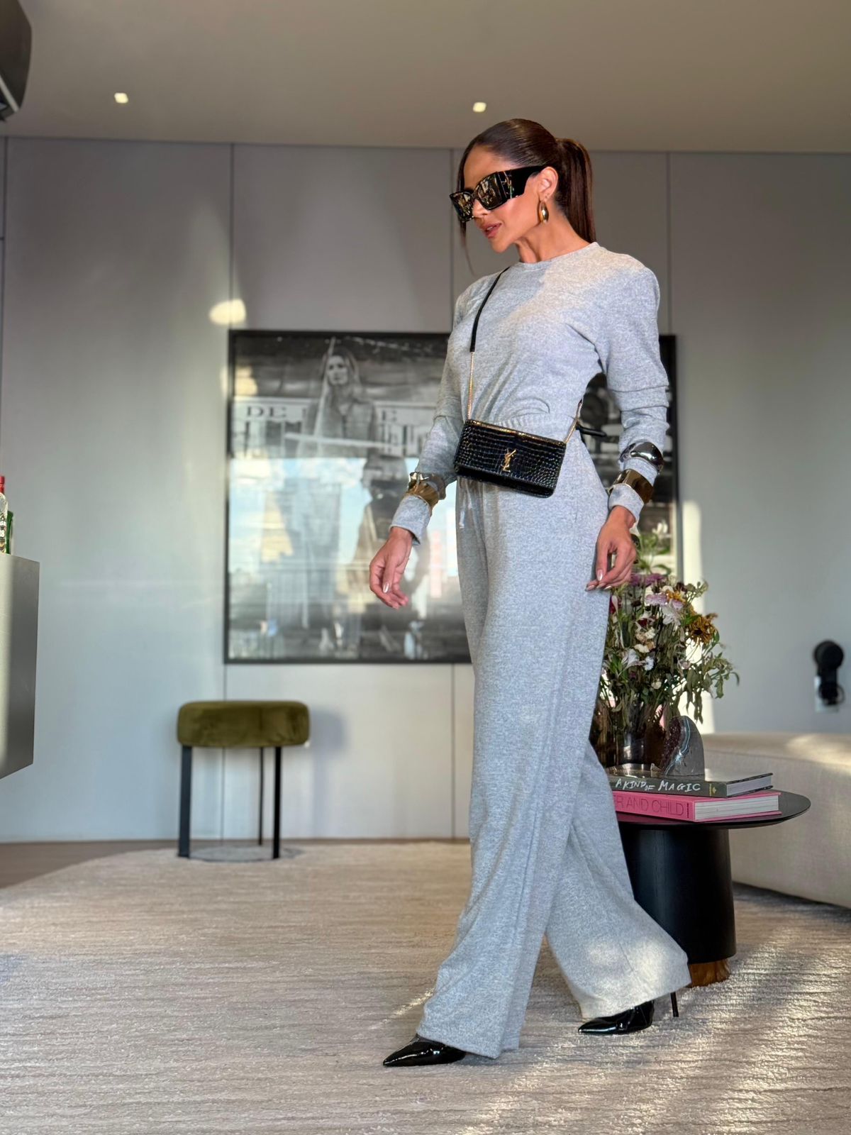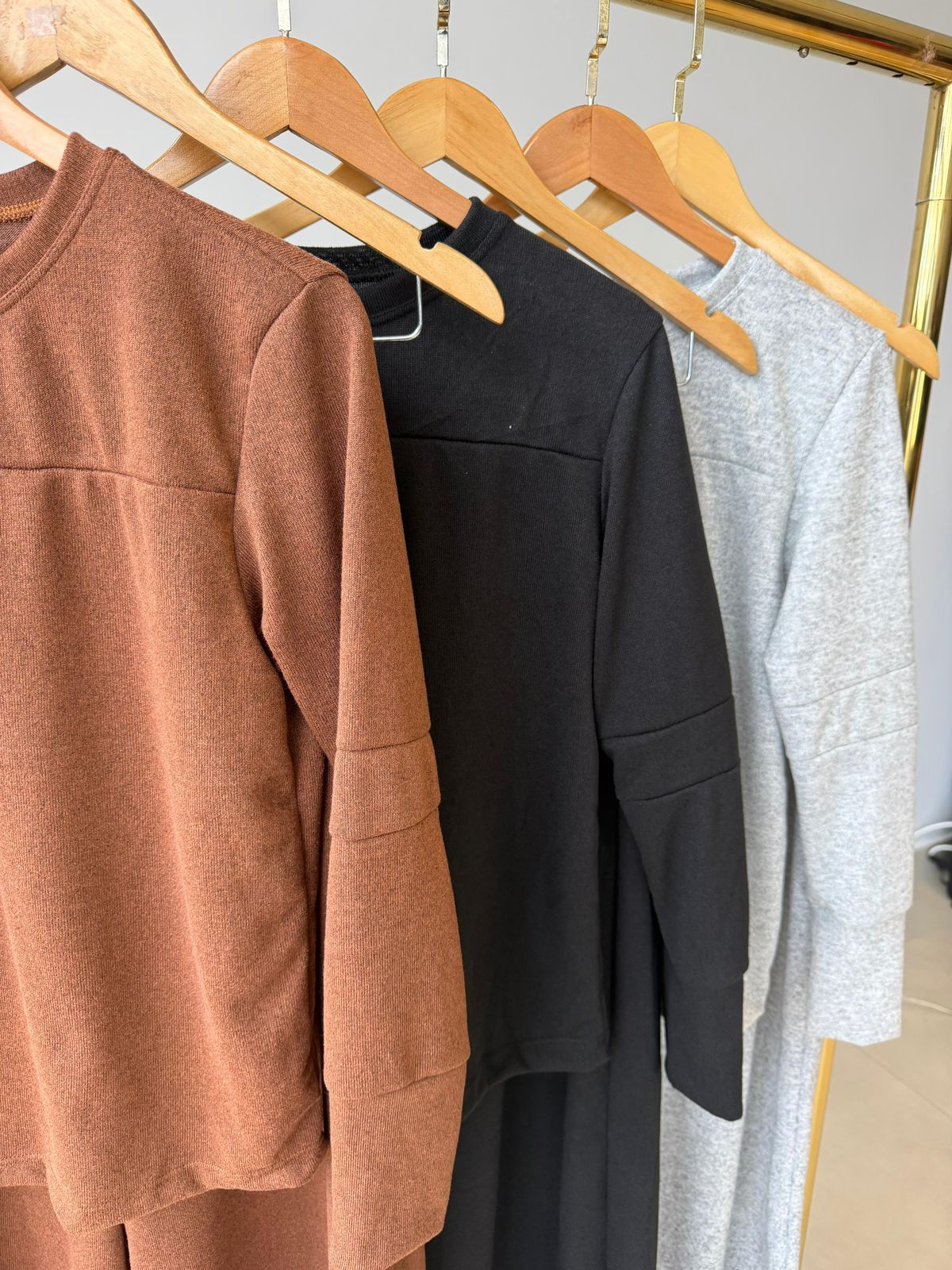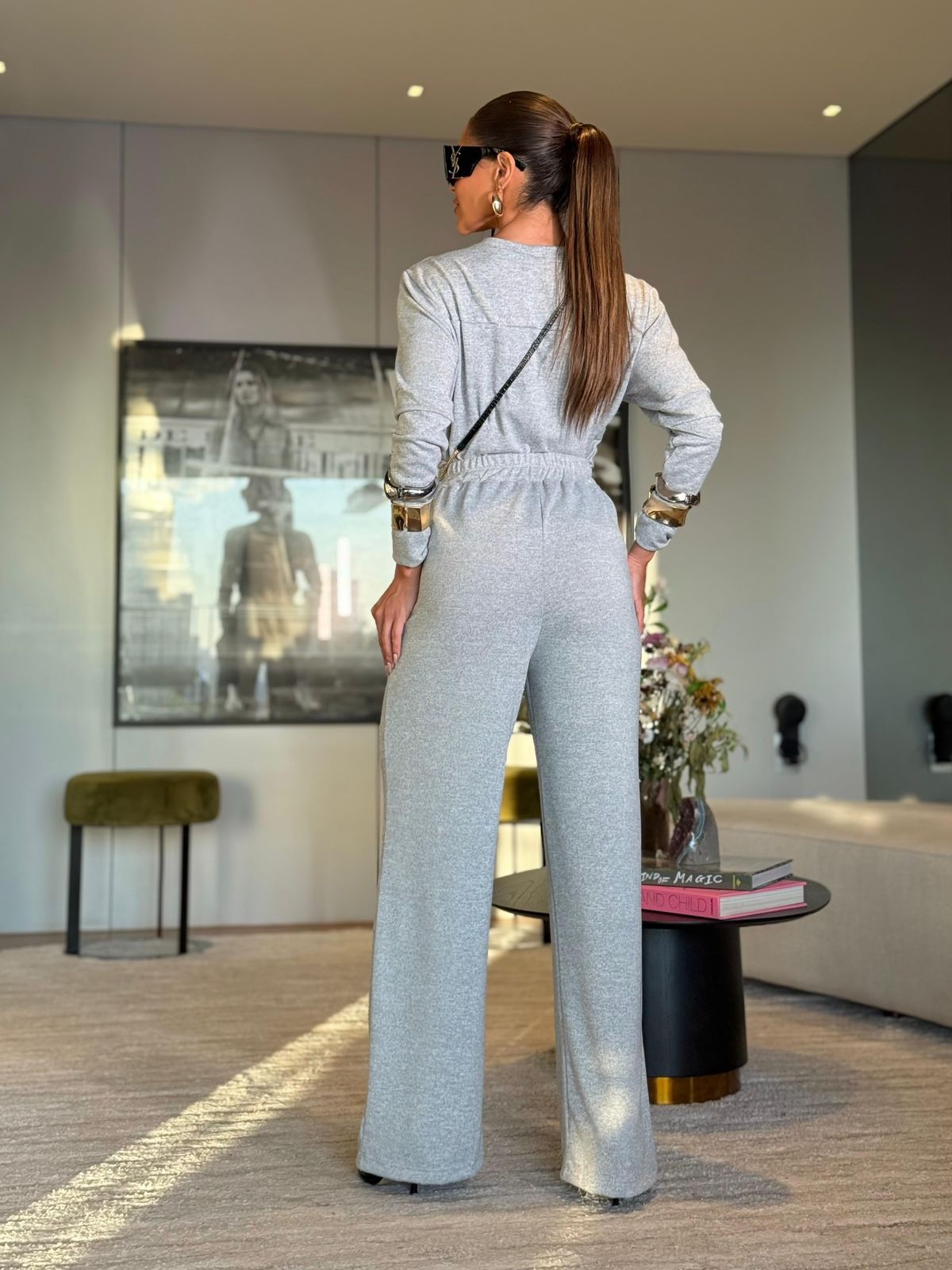 Tecido: lãzinha blusa manga longa, com recortes na manga, calça pantalona cos alto com elástico e bolso
